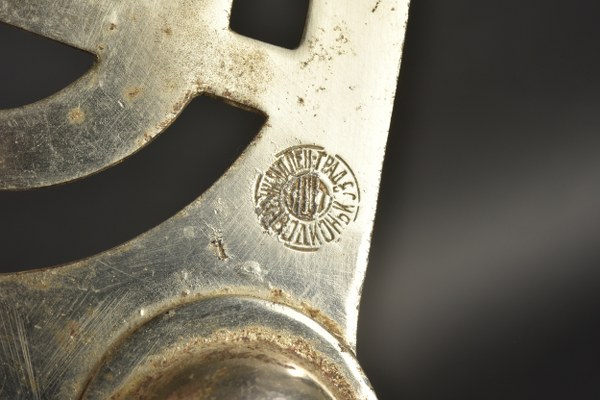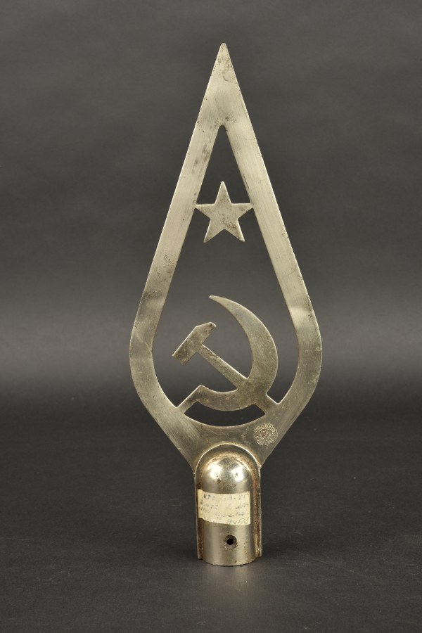 Pointe de drapeau russe. En métal, couleur argenté à 70%. Marquages illisibles. Hauteur 33,5 cm. A noter une certaine usure et patine de la pièce, ainsi que quelques traces d'oxydation. Etat II+. 2+