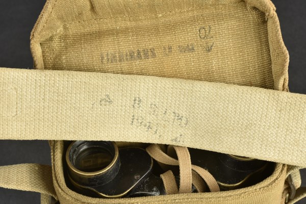 Jumelles britannique. Housse en épaisse toile web. Bouton pression complet. La sangle de transport est présente, mais d'une couleur différente. Datée 1944. Paire de jumelle Bino Prism N°2 MKII X6 Numéro 114687, Graticules Kershaw 1943. La sangle de transport est présente. Optique claire et graduée présentant quelques tâches. A noter une certaine usure et patine de la pièce, ainsi que quelques tâches. Etat II+. 2+