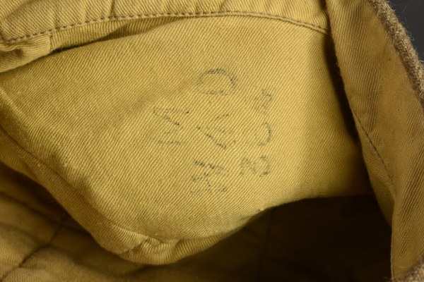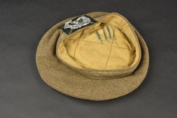 Bérets des Gordons Highlanders. En laine de serge marron. Tartan écossais cousu machine. Reproduction de l'insigne des Gordon Highlanders. Pompon en laine marron complet. Intérieur doublé en molleton jaune. Les marquages sont caviardés. A noter une certaine usure et patine de la pièce, ainsi que quelques tâches. Etat II+. 2+
