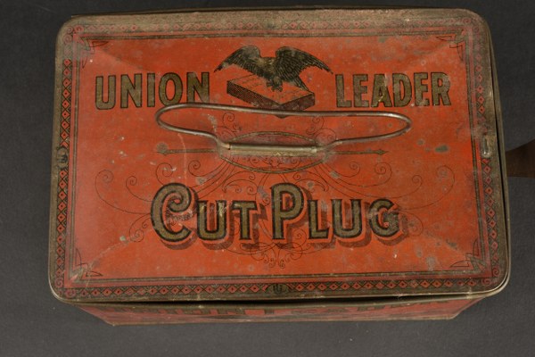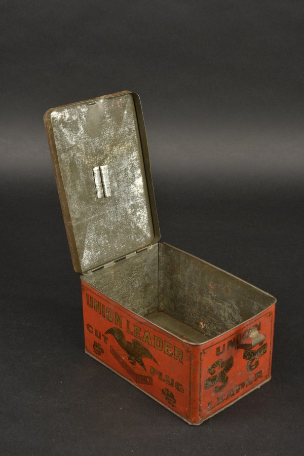 Boite Union Leader. En métal, vide. La poignée de transport est présente, ainsi que les crochets de fermeture. Les décors sont en très bon état. A noter une certaine usure et patine de la pièce. Etat II+. 2+