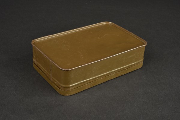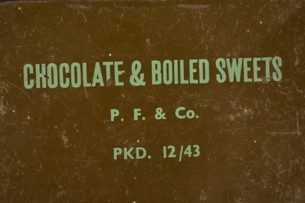 Boite de bombons britannique. En métal, vide. Couvercle complet. Ouverte. Quelques bosses visibles sur l'ensemble de la boite. Marquages Chocolate & Boiled Sweets, fabrication PF & Co PKD 12/43. A noter une certaine usure et patine de la pièce. Etat II+. 2+