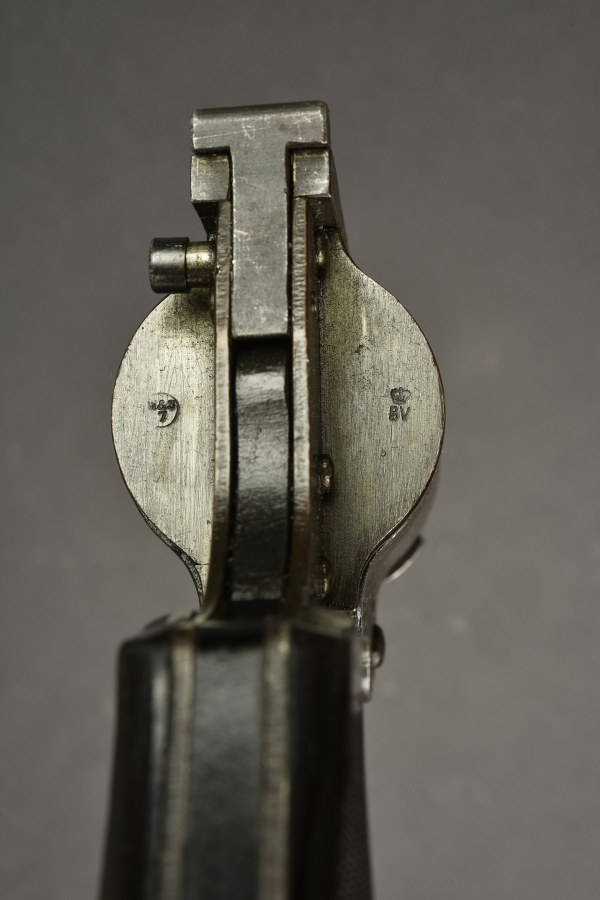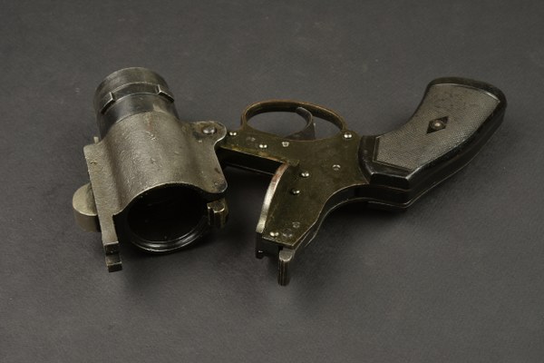 Pistolet lance fusée britannique. En métal, fortement nettoyé. Couleur noire à 60%. Toutes les pièces mobiles sont fonctionnelles. Plaquettes en bakélite noire. Anneau grenadière absent. Beau canon lisse. Marquages N°4 MK1, numéro 49173, daté 1943. A noter une certaine usure et oxydation de la pièce. Etat II+. 2+