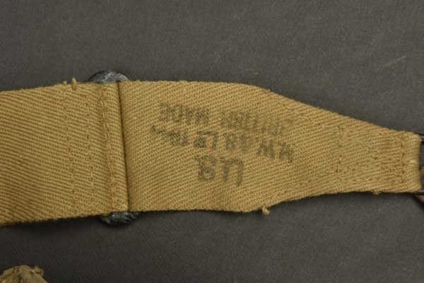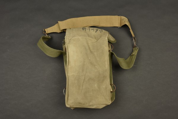 Musette General Purpose US. En forte toile OD. Reste de marquages US visibles. Marquages fabricant illisibles daté 1943. Sangle de transport présente, fabrication US MW & Ltd 1944 British Made. Les pèces métalliques sont fortement oxydées. Ensemble fortement usé avec des tâches. Etat II+. 2+