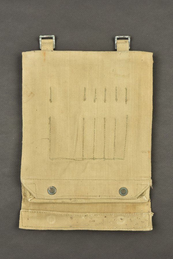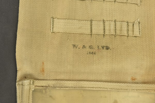Porte carte britannique. En forte toile web, fortement décoloré par le soleil. Les boutons pressions sont fonctionnels. La sangle de transport est manquante. Daté 1944. Mica complet. Les parties métalliques présentent des marques d'oxydation. A noter une certaine usure et patine de la pièce, ainsi que des tâches. Etat II+. 2+