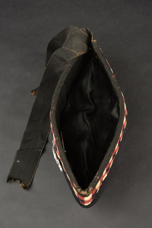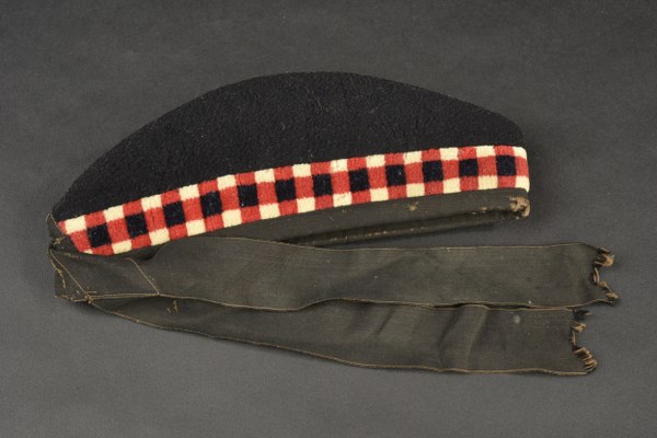 Glengarry. En tissu laineux noir. Damier noir/blanc/rouge. Reproduction d'un cap badge. Les cordons sont effilochés. Pompon rouge complet. Intérieur doublé en satinette noire. Sans marquages visibles. A noter une certaine usure et patine de la pièce, ainsi que des traces de mite. Etat II+. 2+