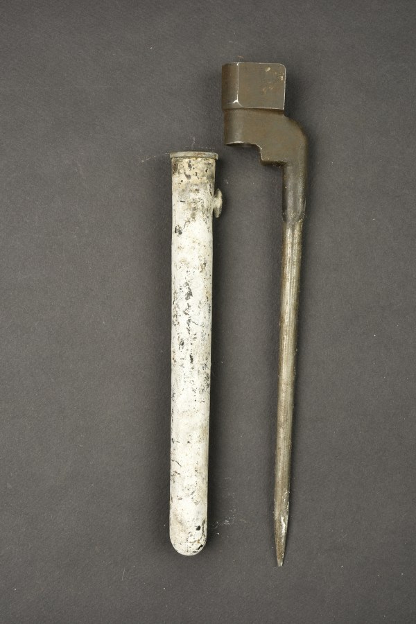Baïonnette anglaise clou MkII fourreau camouflé blanc. Baïonnette clou N°4 MkII avec fourreau camouflé à la chaux blanche. Usure, patine. II