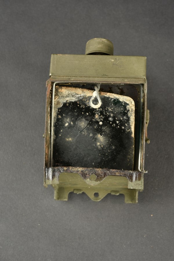 Lanterne britannique. En métal, couleur kaki à 80%. La poignée de transport est présente. Filtre en très mauvais état. Les marquages sont illisibles. A noter une certaine usure et patine de la pièce, ainsi que des marques d'oxydation. Etat II+. 2+