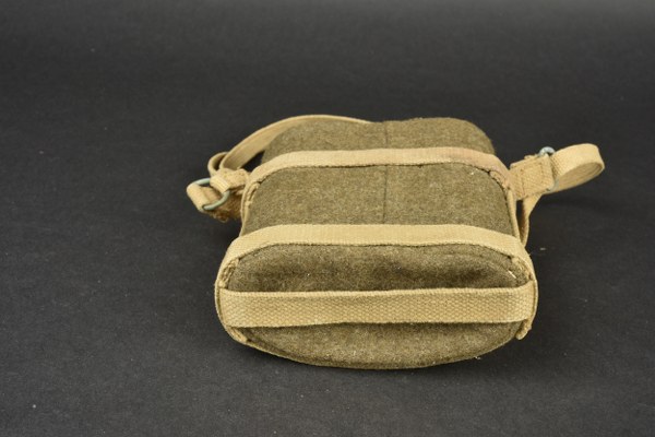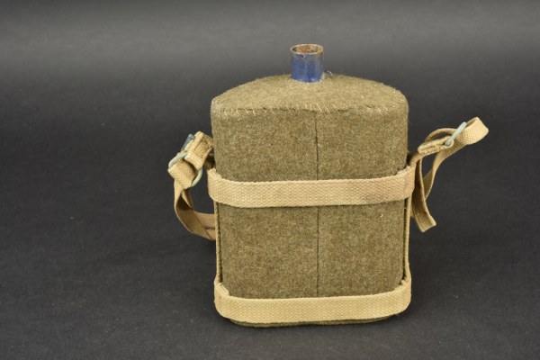 Gourde britannique. En métal émaillé bleu, bouchon manquant. Housse en feutrine kaki. Harnais en toile web, complet, marquages illisible. A noter une certaine usure et patine de la pièce. Etat II+. 2+