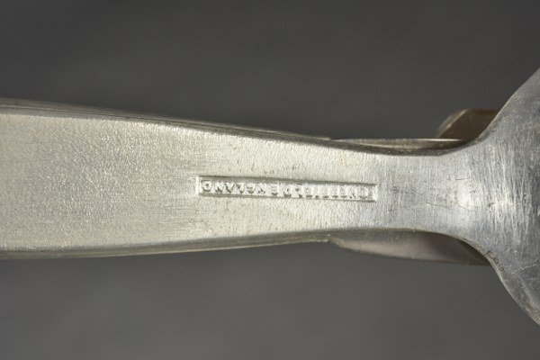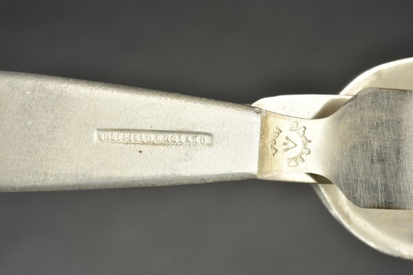 Couverts britannique. Cuillère, couteau et fourchette emboitables. Bien daté 1944 avec broad arrow. A noter une certaine usure et patine des pièces. Etat II+. 2+