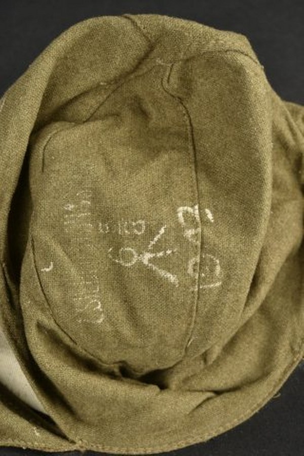 Casquette britannique. En laine de serge. Visière en très bon état. Les rabats sont présents. La jugulaire est cassée. Marquages britanniques partiellement illisibles. Daté 1943. A noter une certaine usure et patine de la pièce. Etat II+. 2+