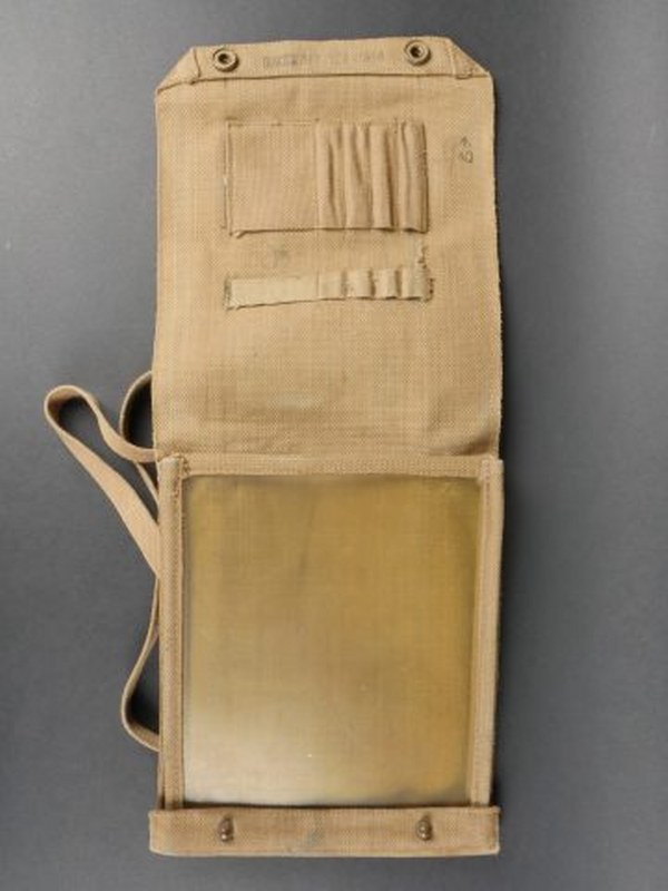 Porte carte britannique. En forte toile web, les boutons pressions sont fonctionnels. La sangle de transport est présente. Marquages partiellement illisibles, datés 1944. A noter une certaine usure et patine de la pièce. Etat 2+