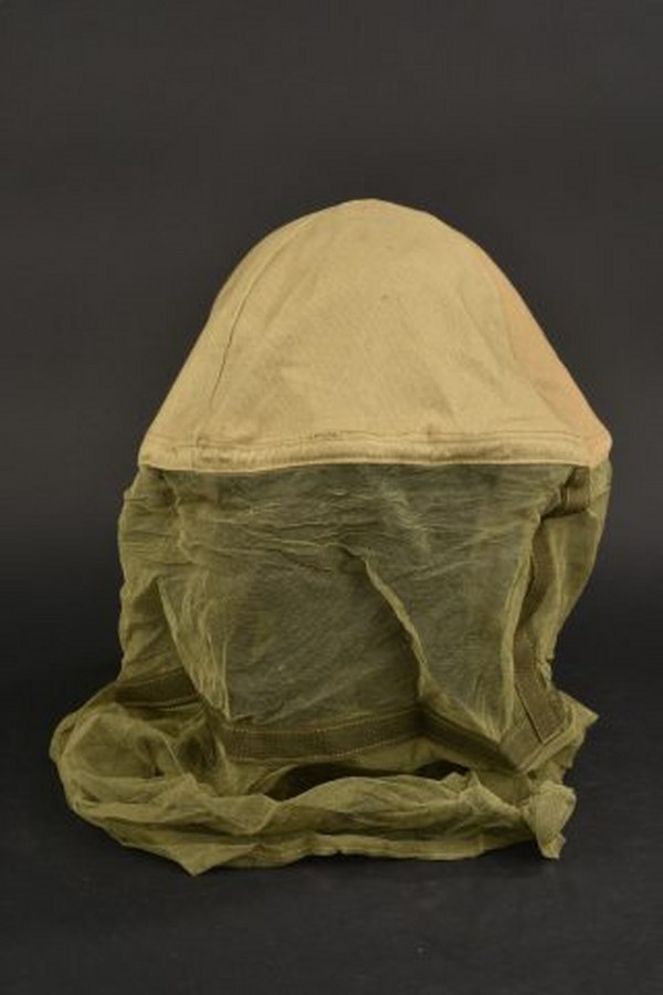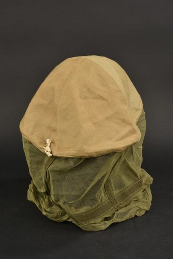 Moustiquaire de casque britannique. Partie supérieure en épais tissu beige, deux coupons différents ont été utilisés pour réaliser la moustiquaire. Cordon de serrage présent. Partie de la moustiquaire en fin tissu nid d'abeille kaki. Marquages B& Co Ltd 1944 avec broad arrow. A noter une légère usure et patine de la pièce, ainsi que quelques tâches. Etat II+. 2+