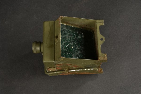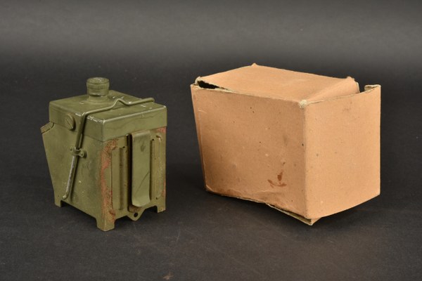 Lanterne britannique. En métal, couleur kaki à 80%. La poignée de transport est présente. Filtre en très bon état. Les marquages sont illisibles. Belle boite en carton ouverte, marquée Lantern Electric Traffic NO 2 WB 3190. Quelques déchirures visibles. A noter une certaine usure et patine de la pièce, ainsi que des marques d'oxydation. Etat II+. 2+