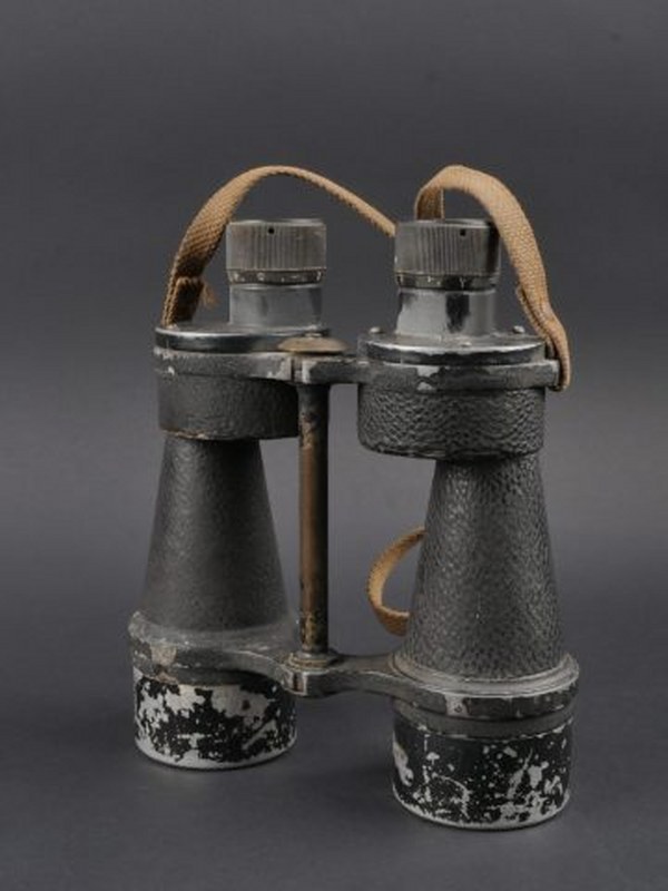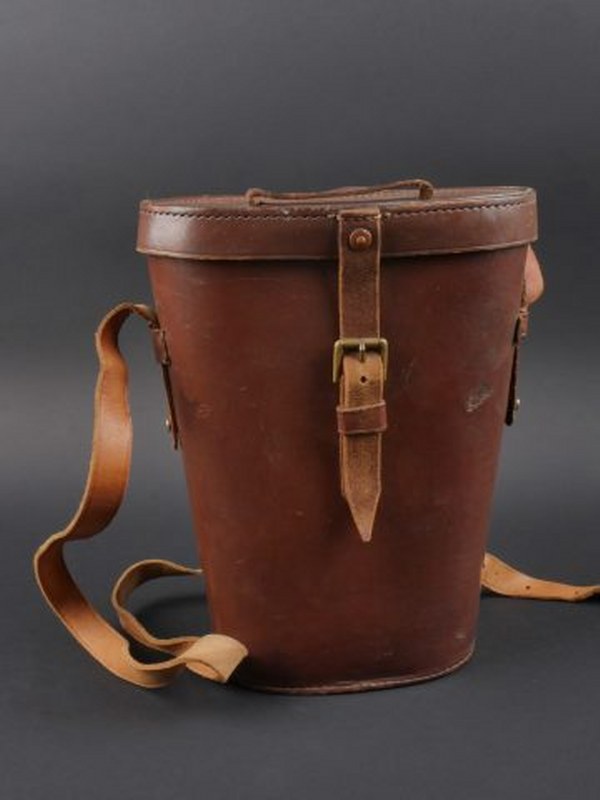 Jumelle britannique. Jumelle en métal, revêtement en bon état. Repeinte en noir. Marquages Bino Prism N°5 MK II 1940. La sangle de transport en web est présente. Optique claire présentant quelques tâches. Housse en épais cuir marron. La sangle de fermeture est fonctionnelle, la sangle de transport est présente. Sans marquages visibles. A noter une certaine usure et patine des pièces. Etat II+. 2+
