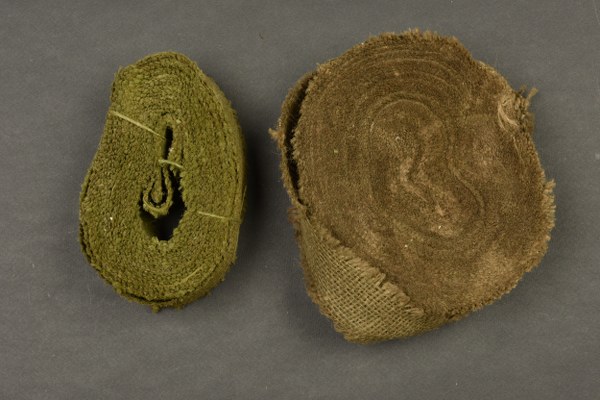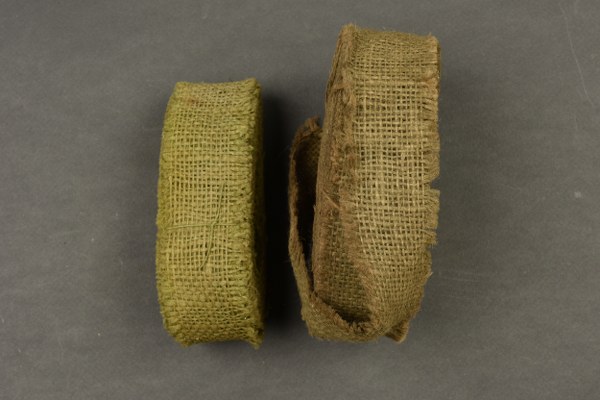 Rouleaux de toile de jute. Deux rouleaux incomplets, permettant de réaliser des bandes de camouflage pour casque. A noter une certaine usure et patine des pièces. Etat II+. 2+