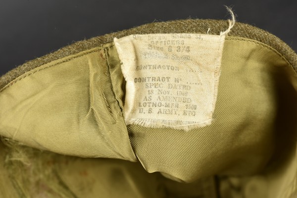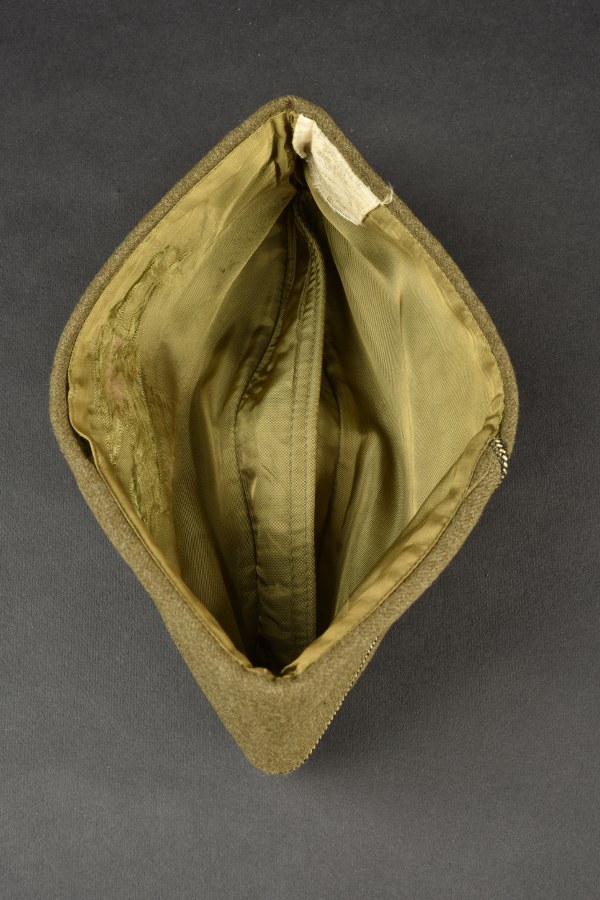 Calot d'officier US. En drap kaki. Liseré noir et or typique du corps des officiers US. Intérieur doublé en satinette kaki. Etiquette du tailleur visiblement arrachée. Etiquette du fabricant partiellement illisible. Taille 6 3/4. A noter une certaine usure et patine de la pièce, ainsi que quelques accrocs et tâches. Etat II+. 2+
