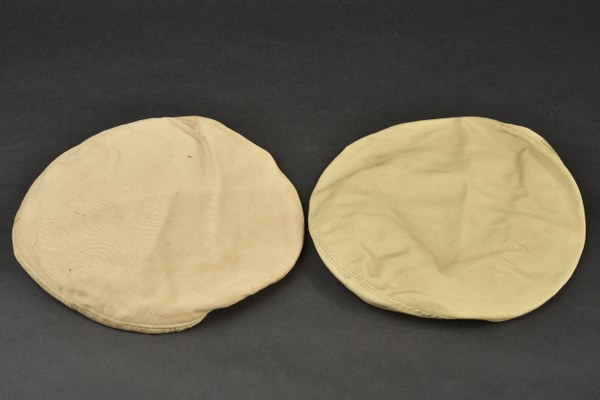 Deux coiffes chino pour casquette. Les étiquettes sont illisibles. A noter une certaine usure et patine des pièces, ainsi que des tâches. Une certaine décoloration est visible sur une des deux pièces. Etat II+. 2+