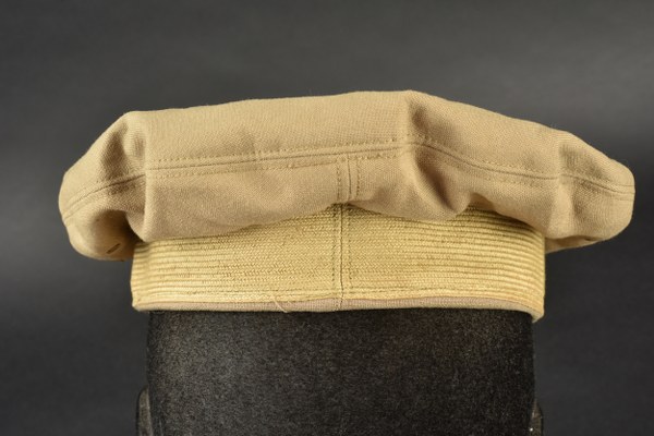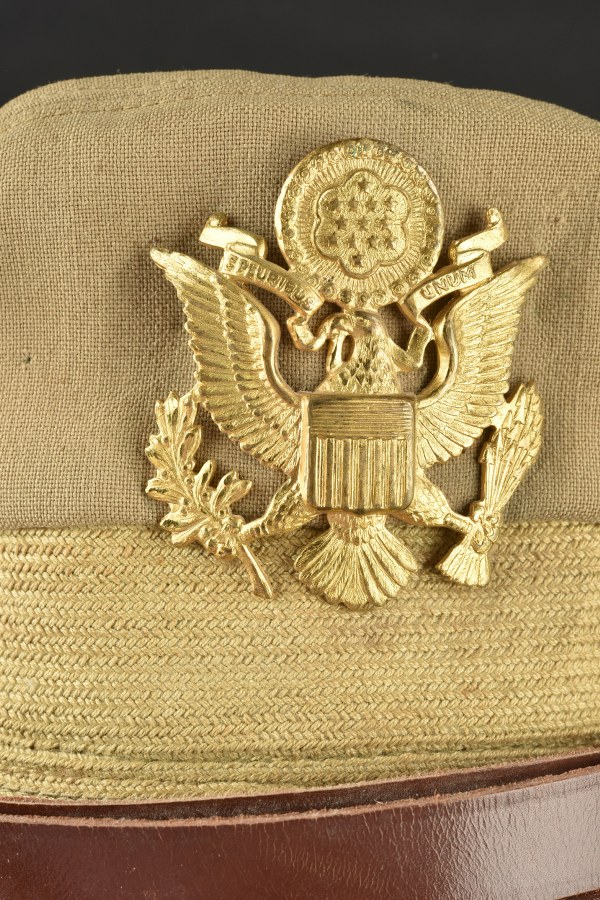Casquette d'officier US. En tissu chino. Visière en cuir souple. Très belle forme cassée. Insigne d'officier en métal doré. Fausse jugulaire en cuir marron. Fermoir à vis. Bandeau en mohair beige. Intérieur doublé en tissu imperméabilisé marron. Logo du fabricant illisible. Indication nominative sous la visière BC Dunnam Capt. Bandeau de sudation en cuir marron. Fabrication 7 lighter Bancroft. A noter une certaine usure et patine de la pièce, ainsi que quelques tâches et accrocs. Etat II+. 2+