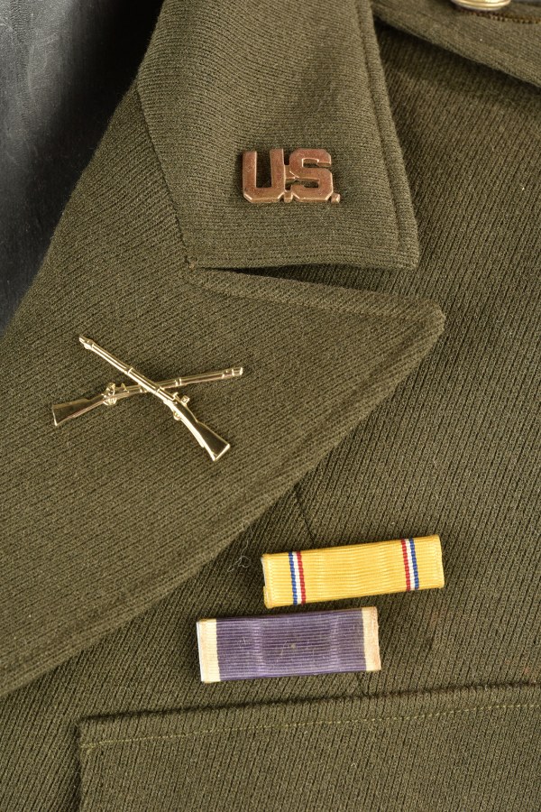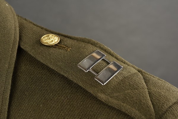 Uniforme d'officier de la 29ème DI US. Comprenant une vareuse en tissu coton couleur chocolat. Tous les boutons dorés et estampillés de l'aigle américain sont présents. La ceinture est manquante. Insigne de manche de la 29ème DI recousu. Grades de capitaine postérieurs. Insignes de col d'officier d'infanterie US. Les insigne de l'infanterie sont postérieurs. Barette de décoration de la purple heart et de l'American Defense. Citation présidentielle complète. Intérieur doublé en satinette kaki. Etiquette du tailleur marquée 375, datée du 1er décembre 1942. Taille 36S. Un pantalon en drap coton couleur chocolat, tous les boutons sont présents. Fermeture éclaire fonctionnelle, mais oxydée. Intérieur doublé en satinette kaki et tissu coton blanc. Etiquette du fabricant 12755, datée du 20 juin 1944. Taille 33R. A noter une certaine usure et patine des pièces, ainsi que quelque discrètes tâches et traces de mite. Etat II+. 2+