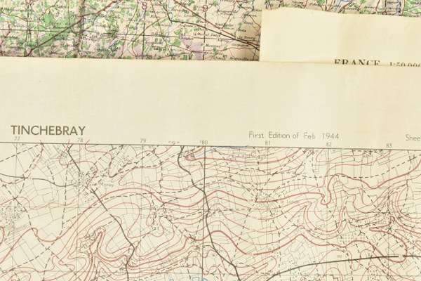 Cartes US. Comprenant une carte Cherbourg/Caen, 4ème éditions, datée 1943. Une carte de Falaise, datée 1943, seconde édition. Une carte de Aunay sur Odon, seconde édition, 1943. Une carte anglaise de Iffendic, première édition de 1944. Une carte de la Haye Du Puit 1943. Une carte de Tinchebray 1944. Une carte de Saint Malo 1944. A noter une certaine usure et patine des pièces, ainsi que des tâches, déchirures et manques. Etat II+. 2+