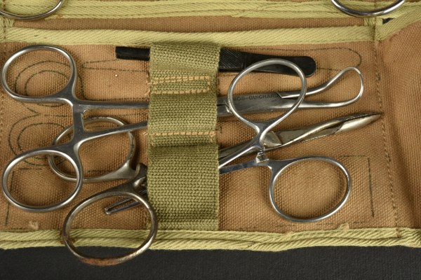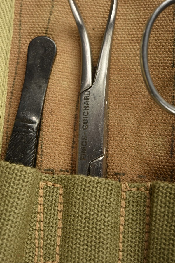 Trousse chirurgicale US pour officier. En forte toile kaki, beau marquages Medical Officers Case. Les boutons pressions sont fonctionnels. Tous les instruments sont de fabrication française moderne. A noter une certaine usure et patine des pièces. Etat II+. 2+