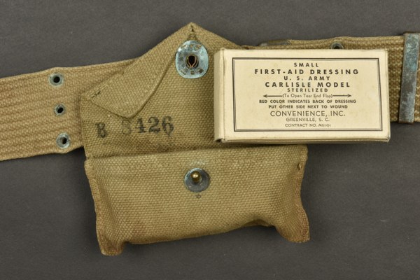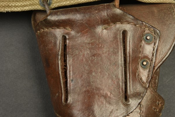 Ceinturon et accessoires US. Comprenant un ceinturon M-36 en forte toile OD. Bouclerie en laiton. Reste de marquages US visibles, les marquages fabricant sont illisibles. Une pochette pour pansement en forte toile OD, le bouton pression est fonctionnel. Le crochet de fixation au ceinturon est présent. Fabrication Bearse MFG CO 1942. Pansement dans sa boite en carton. Un holster de colt 45, en épais cuir marron. Le crochet de fixation au ceinturon est présent. Reste de marquage US visible sur la face avant. Fabrication US Knight 1943. A noter une certaine usure et patine des pièces, ainsi que des tâches. Etat II+. 2+