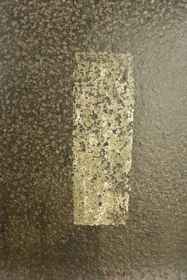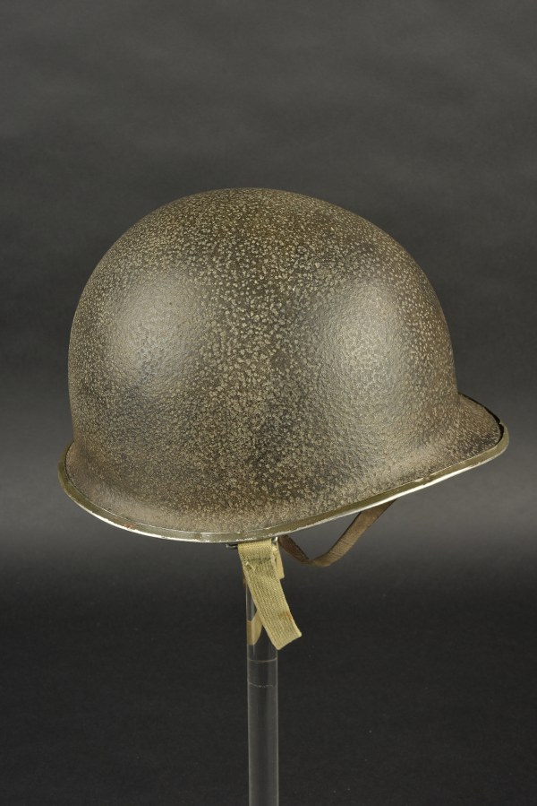 Casque d'officier US. Coque de casque USM1. Fermeture du jonc à l'avant. Celui-ci est partiellement désolidarisé de la coque. Numéro de lot illisible. Les jugulaires sont présentes, mais semblent recousues. L'extérieure de la coque est oxydées. Reste de grade de Major au niveau de la face avant de la coque, à 50%. Barre d'officier au dos de la coque, à 70%. Liner en matériaux composite haute pression, fabrication Westinghouse. Coiffe complète. Les parties métalliques sont oxydées. Jugulaire en cuir présente, sans marquages visibles. Quelques craquelures visibles sur le cuir. A noter une certaine usure et patine de la pièce. Etat II+. 2+