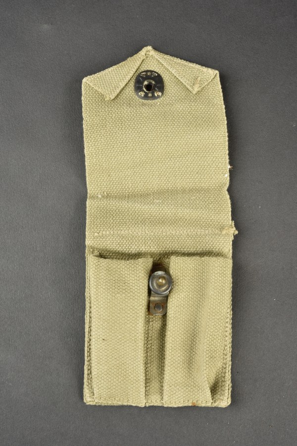 Porte chargeur Colt 45. En forte toile OD décolorée par le soleil. Beau marquage US sur le rabat. Bouton pression fonctionnel. Marquages illisibles. A noter une certaine usure et patine de la pièce, ainsi que des tâches. Etat II+. 2+