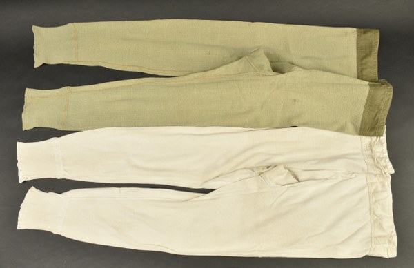 Caleçons US. Comprenant un caleçon long en épais tissu blanc, tous les boutons sont présents, le cordon de serrage est incomplet, sans marquages visibles. Un caleçon long, en tissu kaki, tous les boutons sont présents, cordon de serrage manquant. Les marquages sont illisibles. A noter une certaine usure et patine des pièces, ainsi que des tâches. Etat II+. 2+