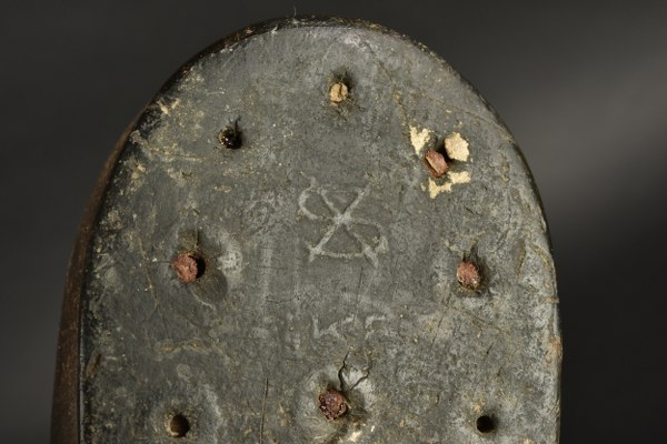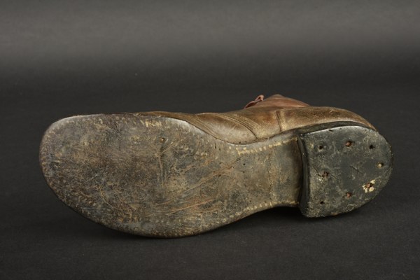 Brodequin US. Un seul brodequin en cuir marron lise. Bout rapporté. Neuf œillets de laçage. Les lacets sont présents. Semelle en cuir et talon en caoutchouc. Sans marquages visibles. Les marquages interne sont illisibles. A noter une certaine usure et patine de la pièce. Etat II+. 2+