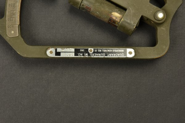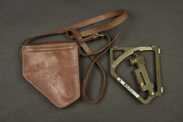 Quadrant Gunners M1. Instrument en métal, peinture kaki à 70%. Plaquette marquées Quadrant Gunners M1, numéro 58130, Mineapolis Honeywell Reg Co 1943. Niveau a bulle fonctionnel. Housse en épais cuir marron. Le bouton pression est fonctionnel. Sangle de transport présente. Marquages Case Carrying M18. A noter une certaine usure et patine de la pièce, ainsi que des tâches au niveau du cuir. Etat II+. 2+