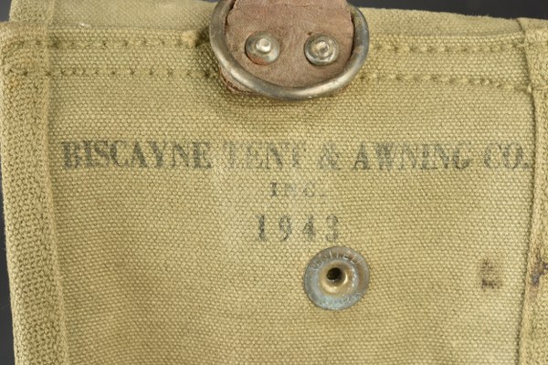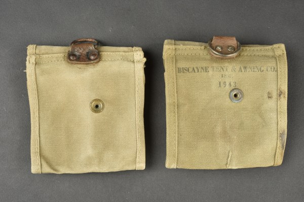 Portes chargeurs pour carabine USM1. Comprenant deux portes chargeurs en forte toile OD. Reste d'un marquage US sur une seule pochette. Les boutons pressions sont fonctionnels. Une seule pochette porte l'inscription du fabricant Biscayne Tent 1943. Les deux pochettes ont été réutilisées par l'armée française. A noter une certaine usure et patine des pièces, ainsi que des tâches. Etat II+. 2+