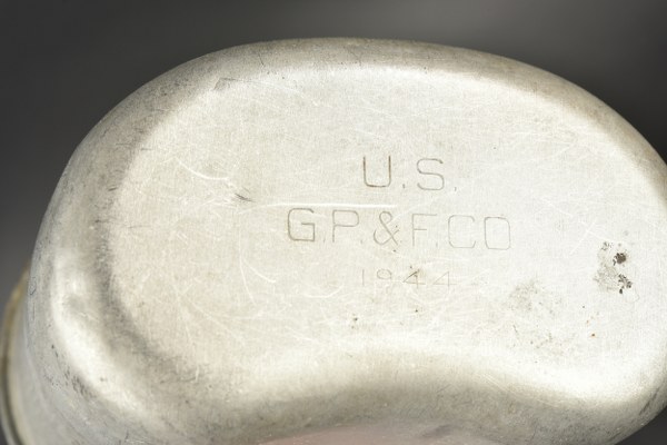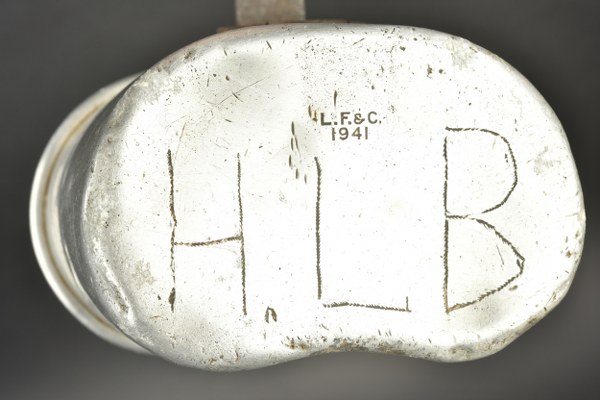 Gourde US. Housse en épaisse toile OD7, les boutons pressions sont fonctionnels. Marquage US et code fabricant illisible. Le crochet de fixation au ceinturon est présent. Reste de laundry number illisible sous la housse. Un quart complet, fabrication LFC 1941, indication nominative HLB gravée sous le quart. Une gourde complète avec son bouchon et sa chaînette, fabrication GP F CO 1944. A noter une certaine usure et patine de la pièce, ainsi que des tâches. Etat II+. 2+