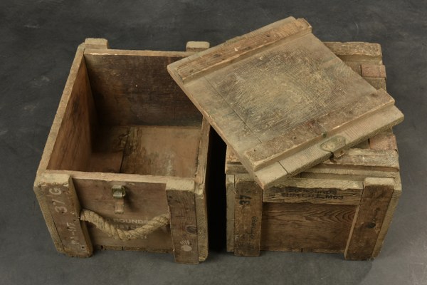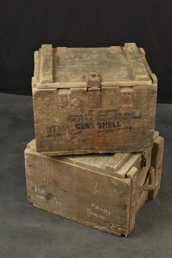 Caisses à munition US. Comprenant une caisse en bois, les crochets de fermeture sont complets, mais oxydés. Marquages Ammunition 20 rounds Complete Shell M63 37 mm Gunshell, datée du mois de novembre 1942. Une caisse en bois, marquée 37mm Gun Canister, couvercle complet, les crochets de fermeture sont oxydés, poignées de transport en cordelettes. Datée du mois d'août 1943. A noter une certaine usure et patine des pièces. Etat II+. 2+