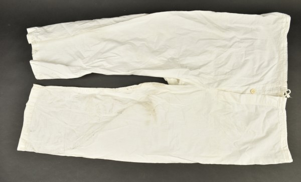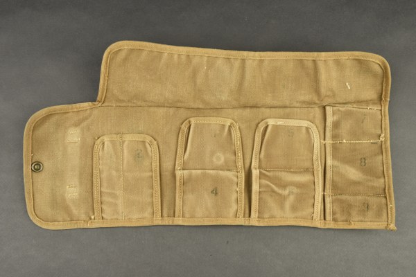 Equipement divers. Comprenant un savon dans son emballage d'origine mais fortement abîmé. Une baguette de nettoyage pour arme, dans sa couleur d'origine à 80%. Deux mats pour tente en bois et métal, datés 1942. Une housse pour gamelle en forte toile OD, sans marquages visible. Une lampe de poche suisse. Une boite en carton vide, marquée Fork Spoon. Deux pièces en tissu de couleur jaune, restes de marquages illisibles. Un petit portefeuille en cuir fortement abîmé, fermeture éclaire fonctionnelle. Un combiné téléphonique en bakélite noir, incomplet. Une pochette en toile imperméabilisé kaki, bouton pression fonctionnel. Un housse en toile imperméabilisé, bouton pression fonctionnel. Une sacoche en forte toile OD, bouton pression fonctionnel, model pour les accessoires de mitrailleuse de 30US. Une grande housse en toile coton écru, sans marquages visibles. Un caleçon civil en tissu coton blanc, sans marquages visibles. A noter une certaine usure et patine des pièces, ainsi que des tâches et accrocs. Etat II+. 2+
