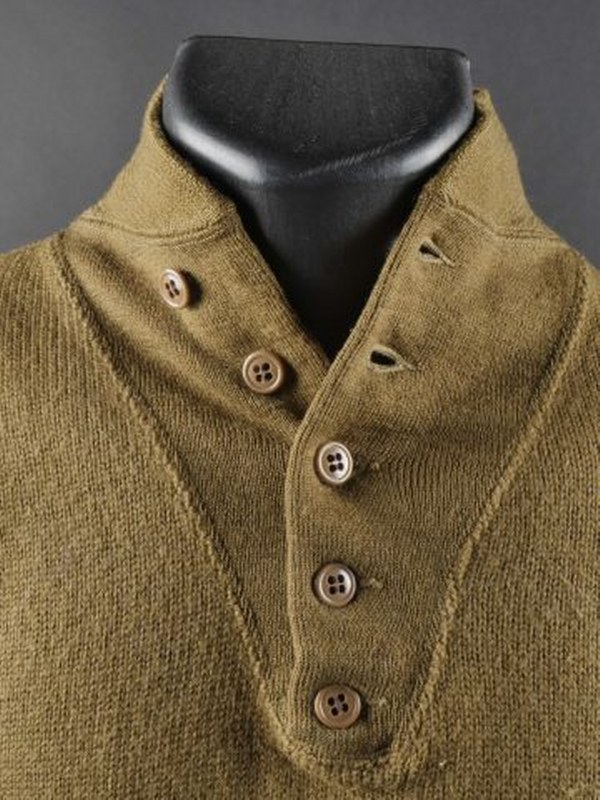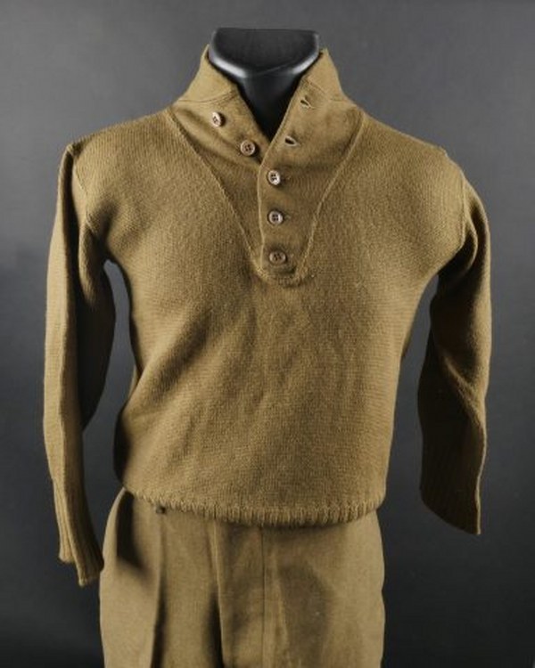 Uniforme US. Comprenant un pull 5 boutons, en épais lainage kaki, les cinq boutons sont présents, trace d'une étiquette dans le col. Quelques discrets trous de mite. Un pantalon moutarde, tous les boutons sont présents, bavette anti-gaz complète, intérieur doublé en tissu coton blanc, taille W 32 L33, étiquette du fabricant Corman & Wasserman, datée du 5 janvier 1945. A noter une certaine usure et patine des pièces, ainsi que quelques traces de mite. Etat II+. 2+