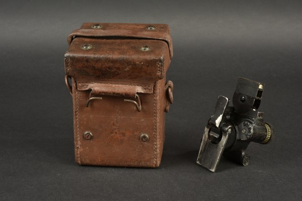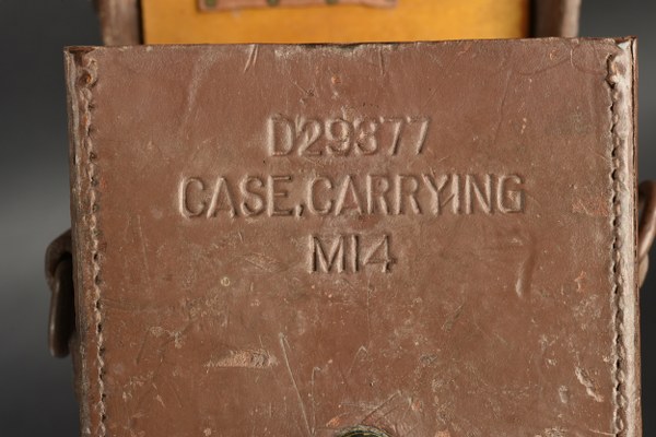 Optique de mortier US. Housse en épais cuir marron. La sangle de transport est manquante. Le bouton pression est fonctionnel. Marquages D29377 Case Carrying M14. Le crochet de fixation au ceinturon est présent. Instrument en métal, complet, dans sa couleur noire d'origine à 80%. Marquages Sight M4 Stock NO 7579927 Serial NO 123623. Toutes les pièces mobiles sont fonctionnelles. A noter une certaine usure et patine de la pièce. Etat II+. 2+