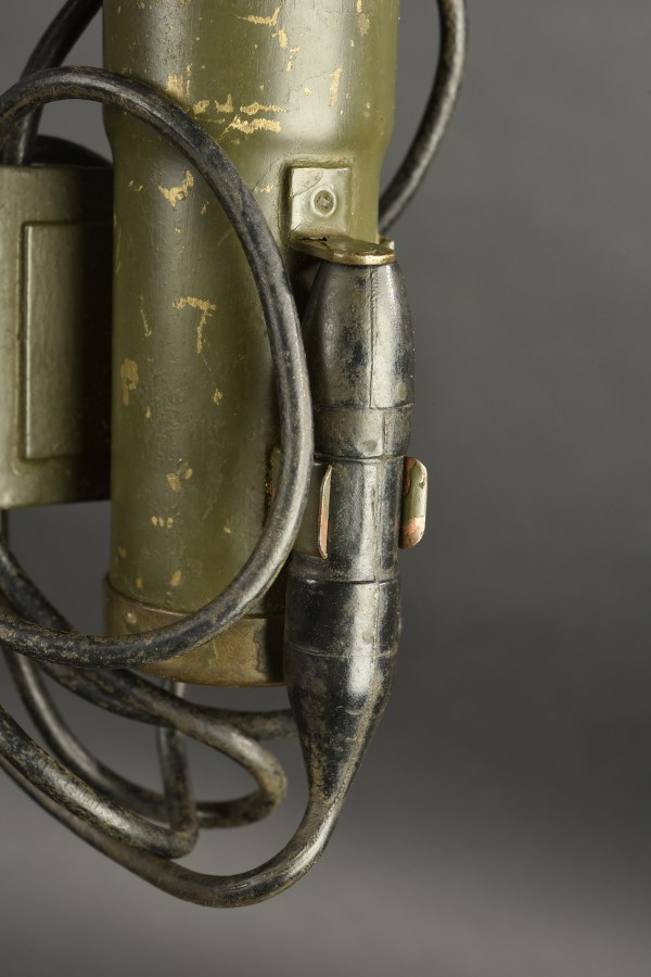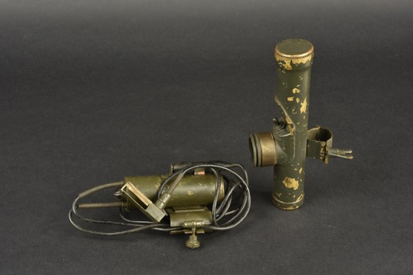 Lampes de mortier US. Comprenant une lampe en métal, peinture kaki à 70%. Marquages Light Aiming post M14. Toutes les pièces mobiles sont fonctionnelles. Attache complète. Filtre vert. Une lampe en métal, peinture kaki à 90%. Toutes les pièces mobiles sont fonctionnelles, câbles et prises présents. A noter une certaine usure et patine des pièces. Etat II+. 2+