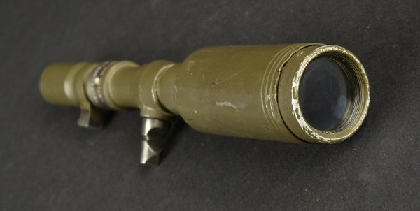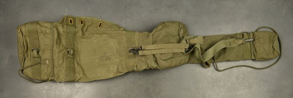 Housse pour canon sans recul US. En forte toile OD7. Toutes les sangles sont présentes. Marquages cover M123 7229946 MRT. On y joint la lunette du canon sans recul, en métal, peinture kaki à 80%. Le système de fixation au canon est présent. Marquages Telescope M86F Serial NO 11604. Optique claire et graduée présentant quelques tâches. Etat II+. 2+
