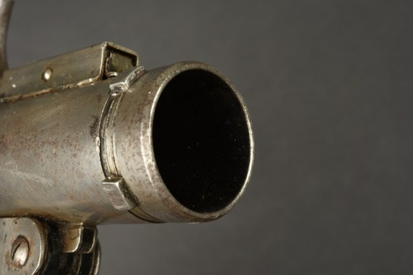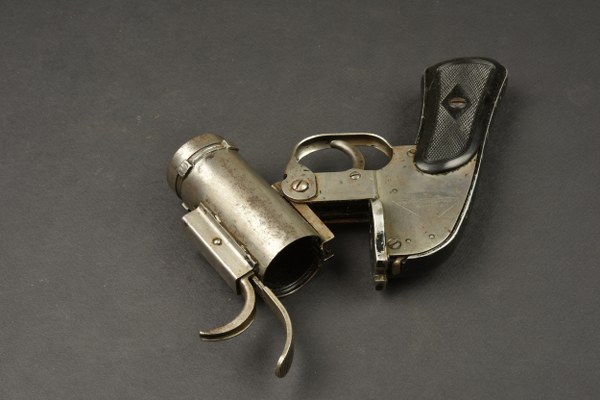 Pistolet lance fusée US. En métal, fortement nettoyé. Toutes les pièces mobiles sont fonctionnelles. Plaquettes en bakélite noire. Beau canon lisse. Marquages CEVC 1942 US Property Pistol Pyrotechnic M-8. A noter une certaine usure et oxydation de la pièce. Etat II+. 2+