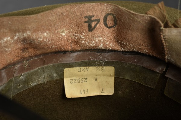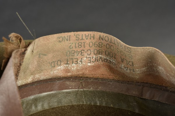 Campaign Hat. En feutrine kaki. Bandeau en tissu coton marron. Insigne troupe US en métal doré, fermoir à vis. Fausse jugulaire en cuir complète. Bandeau de sudation en simili cuir marron. Marquages sous le bandeau Hat Service Felt OD Dla 100-80-C-3480 8405-00-890-1812 Stratton Hats INc. A noter une certaine usure et patine de la pièce, ainsi que des manques. Etat II+. 2+