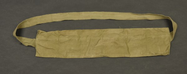 Bandoleer US. En toile kaki, six compartiments visibles. Sans marquages visibles. Une épingle à nourrice présente, et partiellement oxydé. A noter une certaine usure et patine de la pièce, ainsi que des tâches. Etat II+. 2+