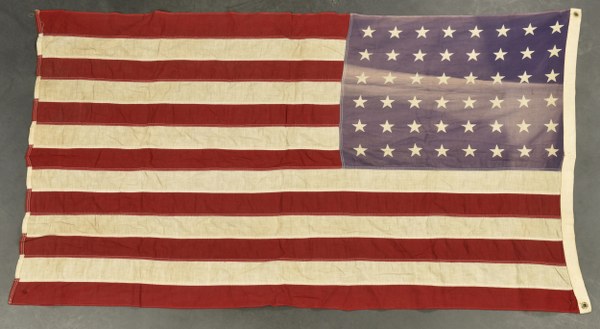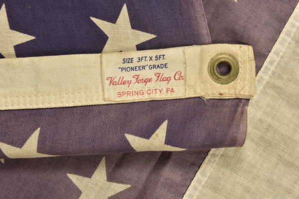 Drapeau US. En tissu coton, fabrication en plusieurs parties. 48 étoiles imprimées. La couleur bleue est fortement décolorée par le soleil. Œillets en laiton. Etiquette du fabricant Valley Forge Flag Co Spring City PA. Dimensions 145 x 240 cm. Dimensions 90 x 150 cm. A noter une certaine usure et patine de la pièce, ainsi que des tâches et accrocs. Etat II+. 2+