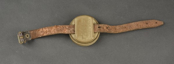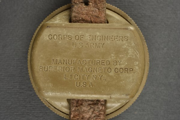 Boussole de poignée US. En bakélite kaki. Fond noir, fonctionnelle. Marquages US ARMY Corps of Engineers Manufactured by Superior Magneto Corp LI City NY. Bracelet en cuir marron, celui-ci est partiellement craquelé. A noter une certaine usure et patine de la pièce. Etat II+. 2+