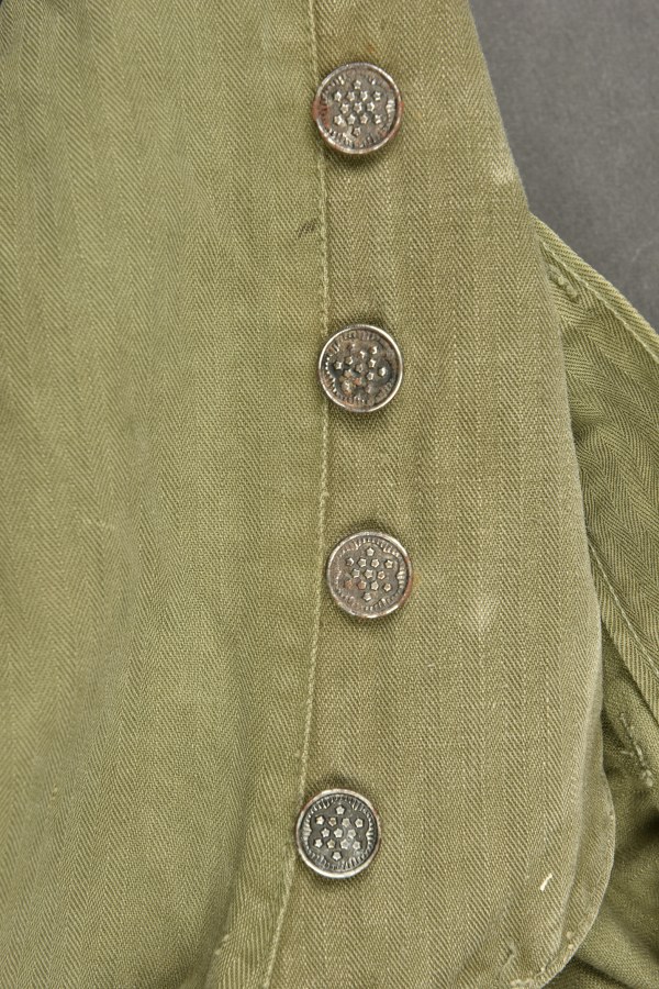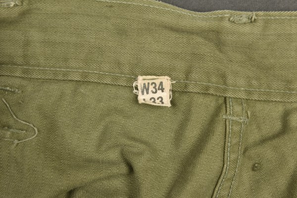 Pantalon HBT. En tissu coton HBT, couleur OD, tous les boutons sont présents et estampillés de 13 étoiles. Bavette anti gaz complète. Deux poches cargo au niveau des hanches. Etiquette indiquant une taille W34 L33. Etiquette fabricant absente. Quelques réparations à la rustine visibles au niveau de la doublure du pantalon. A noter une certaine usure et patine de la pièce, ainsi que quelques réparation. Etat II+. 2+