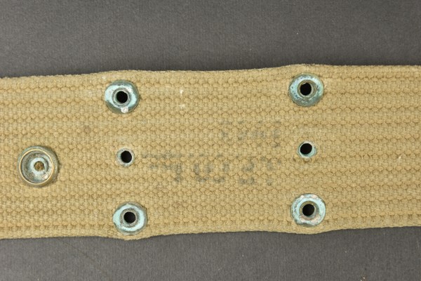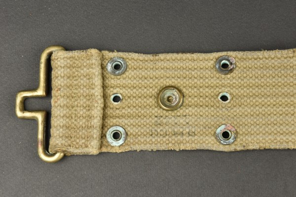 Ceinturons M-36 US. Deux ceinturons en toile OD. Bouclerie en laiton et métal. Les marquages sont illisibles. On y joint une pochette pour le transport de grenade en forte toile OD, modèle à trois compartiments. Les boutons pressions sont fonctionnels. Beau marquage US sur un rabat. Fabrication JQMD 1944. Les sangles de serrage à la cuisse sont incomplètes. A noter une certaine usure et patine des pièces, ainsi que des tâches. Etat II+. 2+