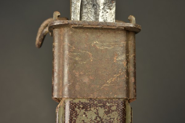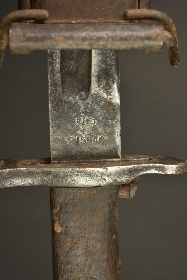 Baïonnette de Garand. Modèle long. Plaquettes en bois. Les garnitures métalliques sont partiellement oxydées. Lame en très oxydée. Fabrication US 215846 SA 1907. Fourreau complet. Le crochet de fixation au ceinturon est présent. Peinture kaki à 30%. Toutes les garnitures métalliques sont fortement oxydées. A noter une certaine usure et patine de la pièce. Etat II+. 2+