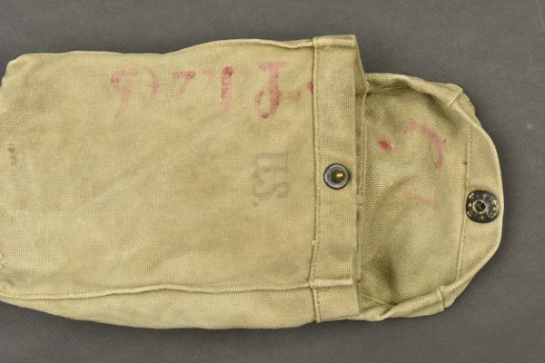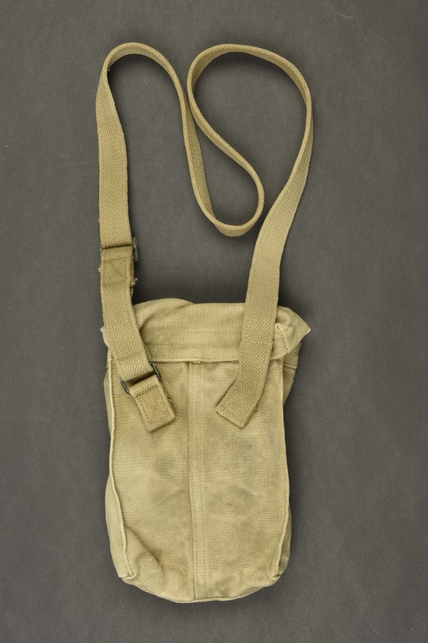 Musette Thompson. En forte toile OD. Beau marquage US sur la face avant. Bouton pression fonctionnel. La sangle de transport est présente. Le marquage fabricant est illisible. A noter une certaine usure et patine de la pièce, ainsi que des tâches de peinture rouge. Etat II+. 2+