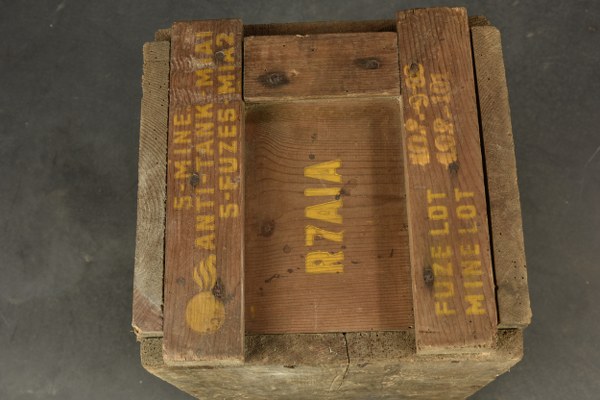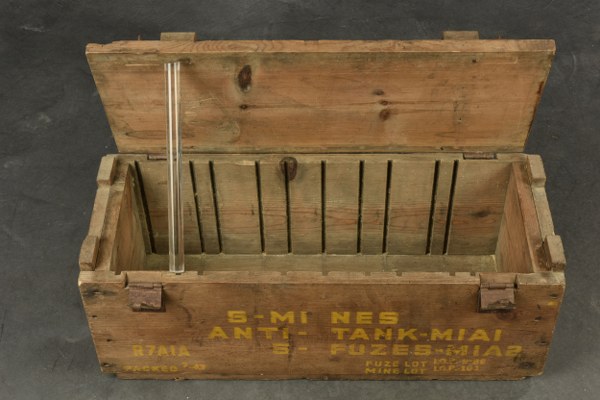 Caisse à munition US. En bois, les fermetures en métal sont complètes mais oxydées. Couvercle marqué Explosive Mine 5 mines Anti Tank M1A1. Belle grenade de l'intendance US. Datée du mois de juillet 1943. A noter une certaine usure et patine de la pièce. Etat II+. 2+
