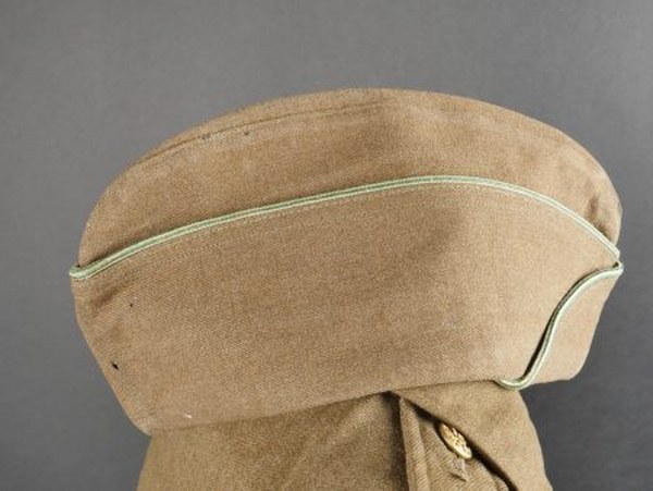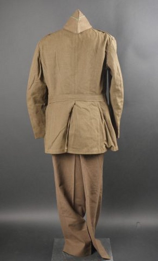 Uniforme US. Comprenant un pantalon en drap kaki, la majorité des boutons sont présents. Intérieur doublé en tissu coton blanc, taille W 32 L31, étiquette du fabricant Carwood MFG CO, datée du 9 décembre 1944. Une vareuse 4 poches en drap kaki. Tous les boutons sont présents. Les insignes sont manquants. Barette de trois rubans de décoration. Etiquette du fabricant datée du 10 juillet 1942, taille 42R. Un calot en drap kaki, liseré blanc et vert. A noter une certaine usure et patine des pièces, ainsi que quelques traces de mite. Etat II+. 2+